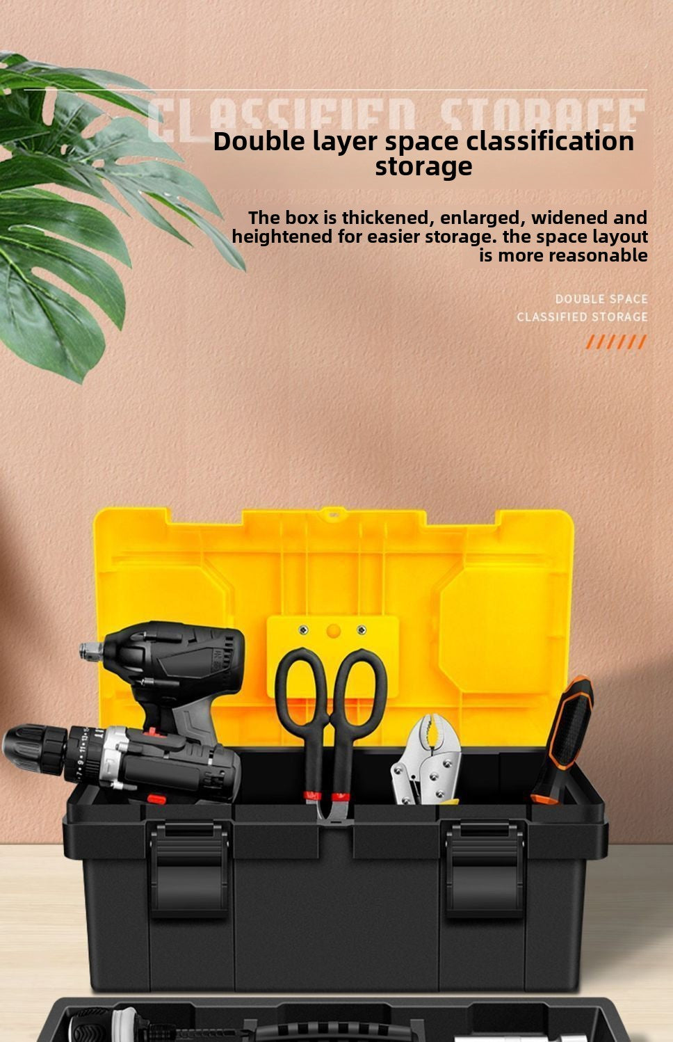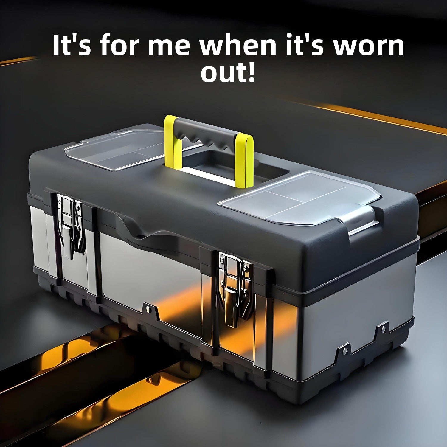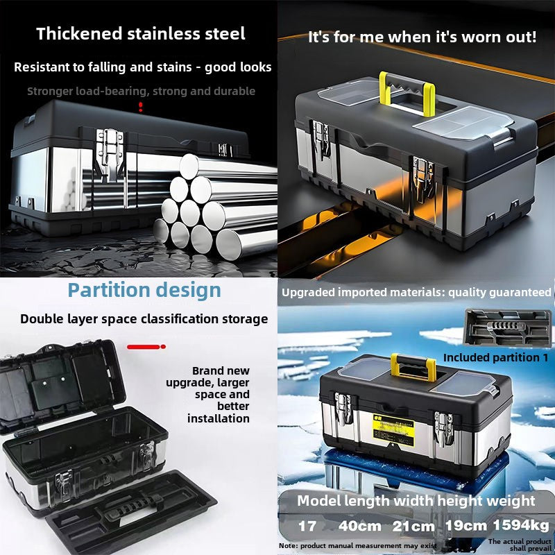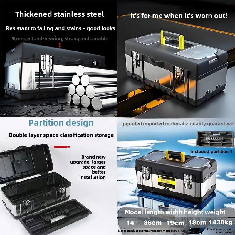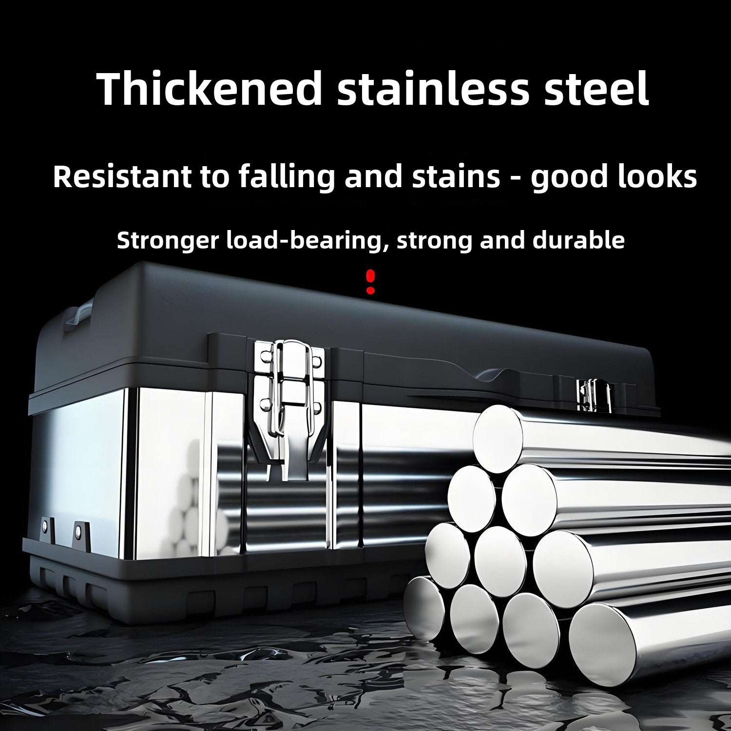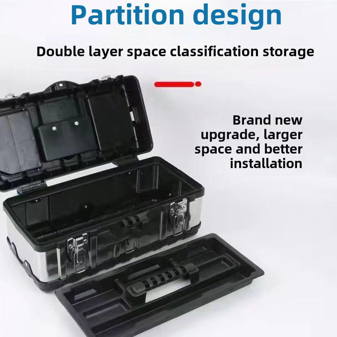 • 不锈钢工具箱顶部有透明盖子隔间,可存放小螺丝、螺母等。