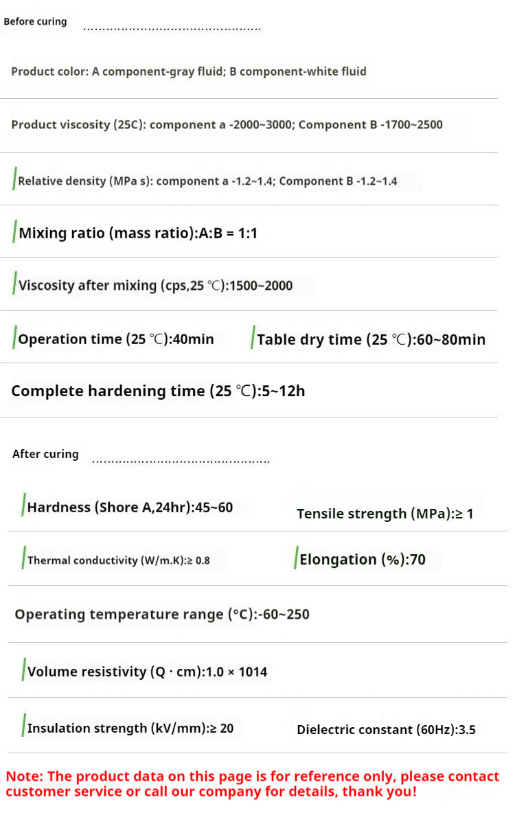 Pre curing parameters Product color: Component A - Grey fluid; Component B - White Fluid Product viscosity (25 ° C): Component A -2000~3000; Component B -1700~2500 Relative density (MPa · s): Component A -1.2~1.4; B component -1.2~1.4 Mixing ratio (mass ratio): A: B=1:1 Viscosity after mixing (CPS, 25 ° C): 1500~2000 Operating time (25 ° C): 40min Surface drying time (25 ° C): 60-80min Complete hardening time (25 ° C): 5-12h Parameters after solidification Hardness (ShoreA, 24hr): 45~60 Thermal conductivity (W/m.K): ≥ 0.8 Tensile strength (MPa) ≥ 1 Elongation rate (%): 70 Temperature range for use (° C): -60~250 Volume resistivity (Q · cm): 1.0x1014 Insulation strength (kV/mm): ≥ 20 Dielectric constant (60Hz): 3.5